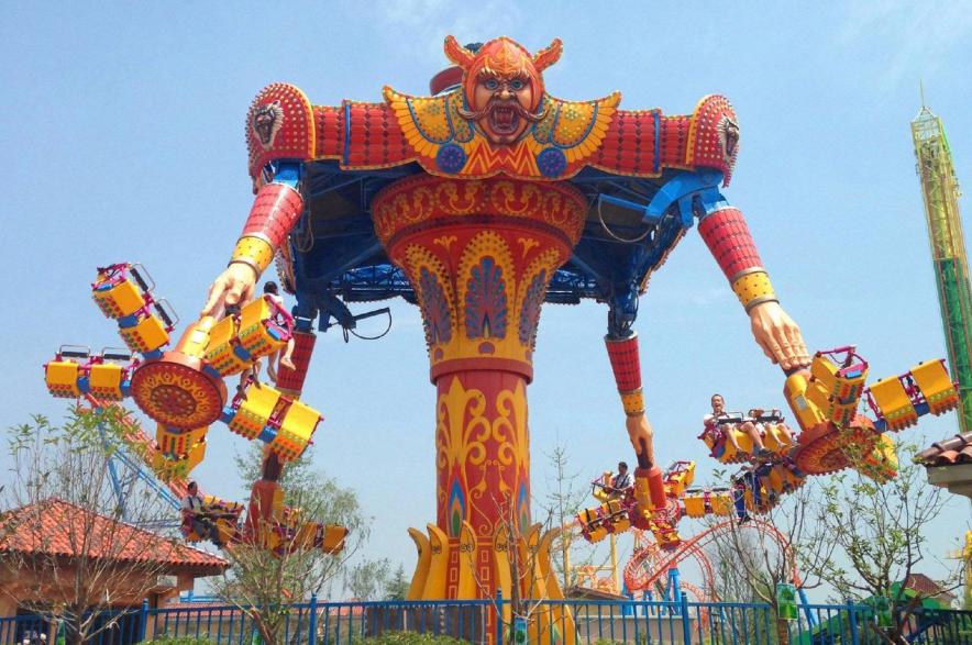 天空中四把伸展的大风车,随着立柱缓缓托起,座舱托臂急速正反自转,在离心力作用下座舱自旋,多种运动叠加结合。风车在14米高空360度优美狂野的舞蹈,自由翻滚、扭动、转向、摇摆、滚动,蓝天白云交织大地,此时除了大喊大叫还能做什么呢?